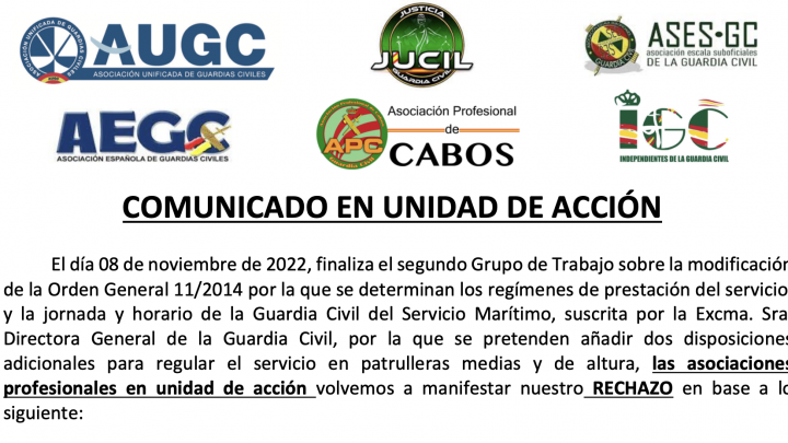 El día 08 de noviembre de 2022, finaliza el segundo Grupo de Trabajo sobre la modificación de la Orden General 11/2014 por la que se determinan los regímenes de prestación del servicio, y la jornada y horario de la Guardia Civil del Servicio Marítimo, suscrita por la Excma. Sra. Directora General de la Guardia Civil, por la que se pretenden añadir dos disposiciones adicionales para regular el servicio en patrulleras medias y de altura, las asociaciones profesionales en unidad de acción volvemos a manifestar nuestro RECHAZO en base a lo siguiente: