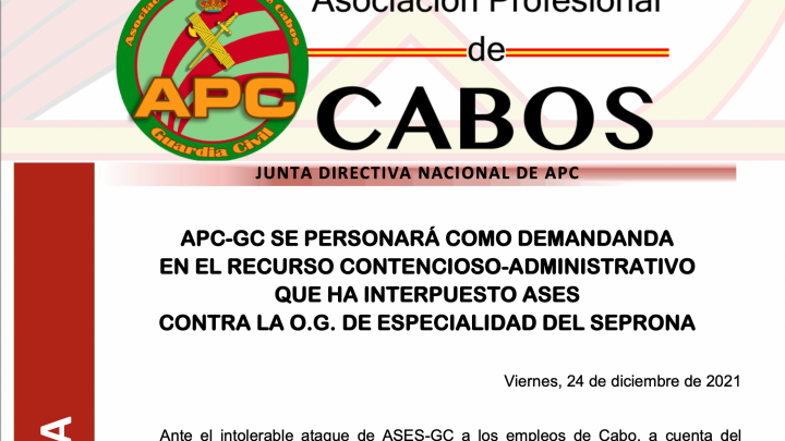Ante el intolerable ataque de ASES-GC a los empleos de Cabo, a cuenta del mando de pequeñas unidades o equipos básicos, los servicios jurídicos de la Asociación Profesional de Cabos de la Guardia Civil se encuentran preparando la personación de ésta como demandada en el procedimiento judicial abierto a raíz del recurso contencioso-administrativo interpuesto por ASES-GC contra la Orden General núm. 29/2021, de 9 de septiembre, por la que se regula la especialidad de Protección de la Naturaleza y la estructura, organización y funciones de las unidades del Servicio de Protección de la Naturaleza.