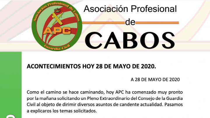Descarga el comunicado en PDF Como el camino se hace caminando, hoy APC ha comenzado muy pronto por la mañana solicitando un Pleno Extraordinario del Consejo de la Guardia Civil al objeto de dirimir diversos asuntos de candente actualidad. Pasamos a explicaros los temas solicitados. Los diversos ceses de Mandos de la Guardia Civil en…