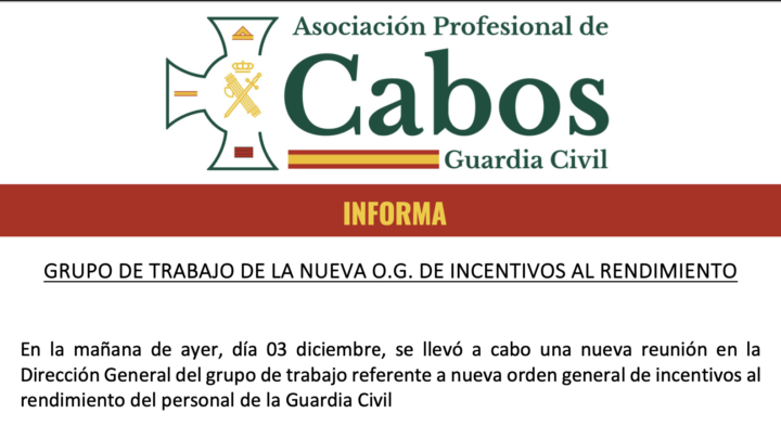 En la mañana de ayer, día 03 diciembre, se llevó a cabo una nueva reunión en la Dirección General del grupo de trabajo referente a nueva orden general de incentivos al rendimiento del personal de la Guardia Civil Se presentaron las siguientes modificaciones respecto de anterior borrador: – Se establecen los porcentajes del CVE para…