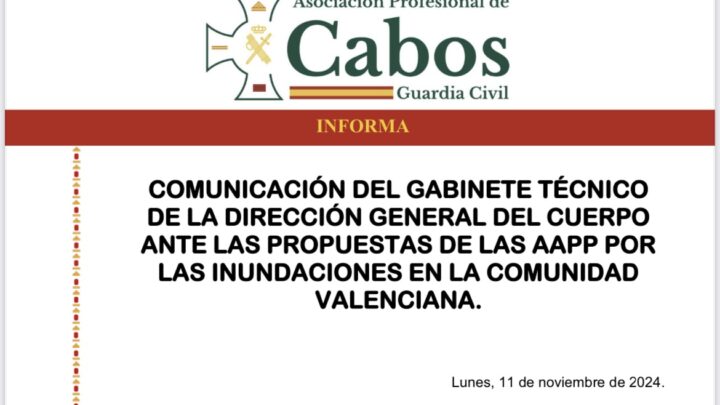 COMUNICACIÓN DEL GABINETE TÉCNICO DE LA DIRECCIÓN GENERAL DEL CUERPO ANTE LAS PROPUESTAS DE LAS AAPP POR LAS INUNDACIONES EN LA COMUNIDAD VALENCIANA.