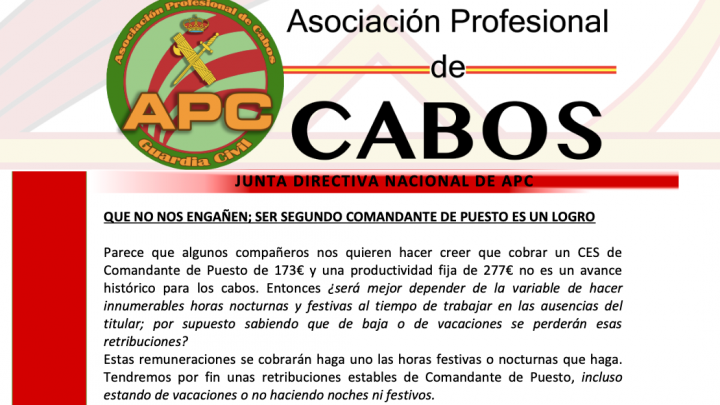 Parece que algunos compañeros nos quieren hacer creer que cobrar un CES de Comandante de Puesto de 173€ y una productividad fija de 277€ no es un avance histórico para los cabos. Entonces ¿será mejor depender de la variable de hacer innumerables horas nocturnas y festivas al tiempo de trabajar en las ausencias del titular; por supuesto sabiendo que de baja o de vacaciones se perderán esas retribuciones?