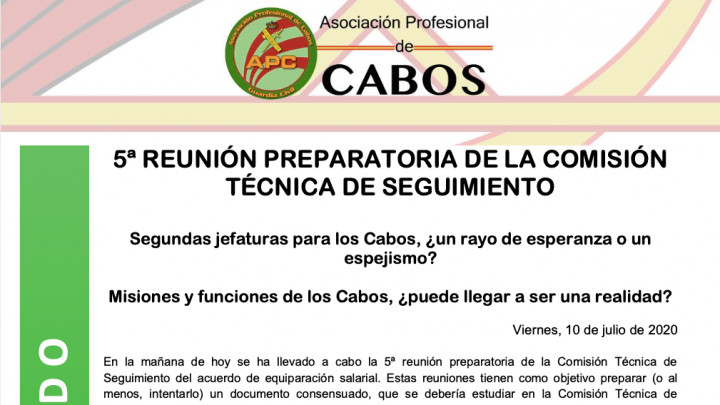 Segundas jefaturas para los Cabos, ¿un rayo de esperanza o un espejismo?   Misiones y funciones de los Cabos, ¿puede llegar a ser una realidad? Descarga el comunicado en PDF En la mañana de hoy se ha llevado a cabo la 5ª reunión preparatoria de la Comisión Técnica de Seguimiento del acuerdo de equiparación salarial.…