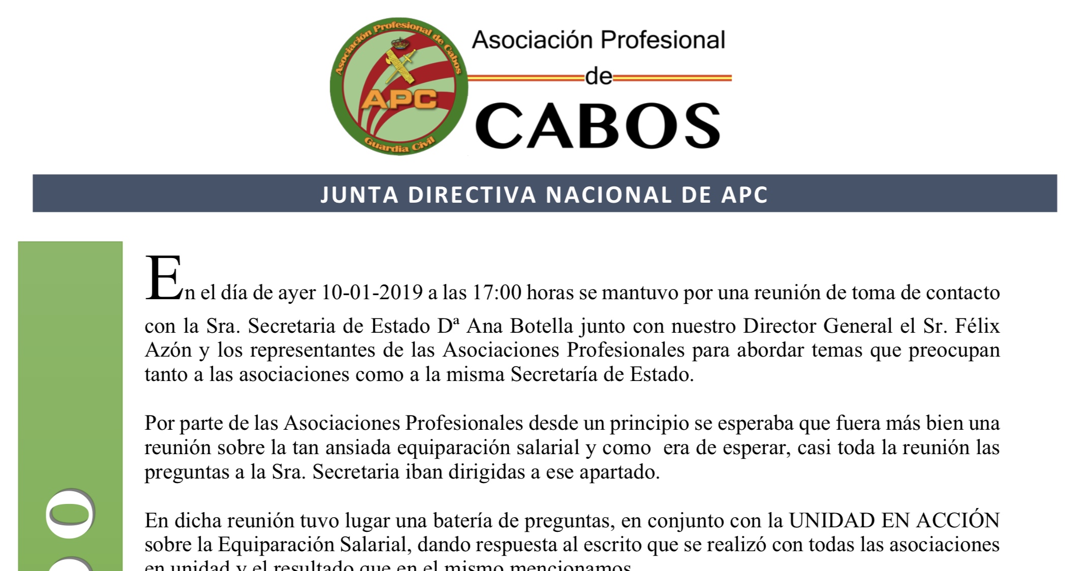 En el día de ayer 10-01-2019 a las 17:00 horas se mantuvo por una reunión de toma de contacto con la Sra. Secretaria de Estado Dª Ana Botella junto con nuestro Director General el Sr. Félix Azón y los representantes de las Asociaciones Profesionales para abordar temas que preocupan tanto a las asociaciones como a…