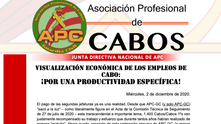 El pago de las segundas jefaturas ya es una realidad. Desde que APC-GC (y solo APC-GC) “sacó a la luz” – como literalmente figura en el Acta de la Comisión Técnica de Seguimiento de 27 de julio de 2020 – este transcendental e importante tema, 1.400 Cabos/Cabos 1ºs ven justamente recompensado su trabajo y esfuerzo que durante tantos años habían realizado de manera “gratuita”. Ahora queda, respecto de esta pretensión genuina de APC-GC, lo menos costoso pero no lo menos importante: regular las funciones y misiones del segundo comandante de Puesto. APC-GC sigue trabajando en la visualización funcional a través de una regulación de nuestras funciones y misiones distintas de los empleos de Guardia Civil y que es muy probable que se aborde dentro del grupo de trabajo que se abrirá el próximo año “sobre los empleos de Cabo del Cuerpo de la Guardia Civil”.