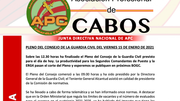 PRIMERO: Conforme al artº 36 de los Estatutos de la Asociación Profesional de Cabos de la Guardia Civil (APC-GC) se convocan elecciones para el nombramiento del Presidente y equipo directivo que conformarán la Junta Directiva Nacional de la mentada Asociación. SEGUNDO: El proceso electoral se regirá por lo establecido en el precitado artº 36 de los Estatutos…