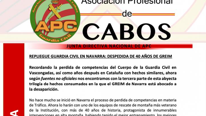 Recordando la perdida de competencias del Cuerpo de la Guardia Civil en Vascongadas, así como años después en Cataluña con hechos similares, ahora según fuentes no oficiales nos encontramos con la tercera parte de esta abyecta trilogía de hechos consumados en la que el GREIM de Navarra está abocado a la desaparición.
