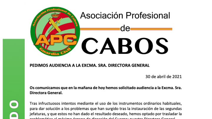 Os comunicamos que en la mañana de hoy hemos solicitado audiencia a la Excma. Sra. Directora General. Descarga el comunicado en PDF Tras infructuosos intentos mediante el uso de los instrumentos ordinarios habituales, para dar solución a los problemas que han surgido tras la instauración de las segundas jefaturas, y que estos no han dado…