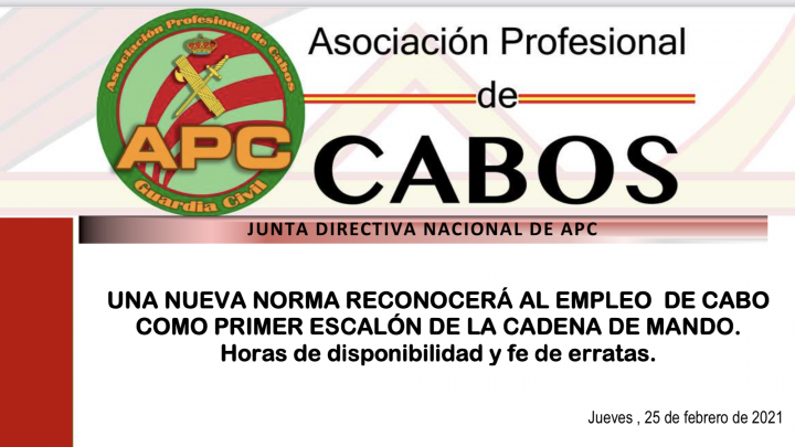 Para APC-GC es esencial que se recoja, en cada norma en la que tenga cabida, que los empleos de Cabo son el primer escalón de mando. Y esta necesidad de reconocimiento es necesaria como puente que nos permita llegar a medidas más “tangibles” para nuestros intereses y que necesariamente se deben tomar para visualizar y (posteriormente) potenciar los empleos de Cabo.