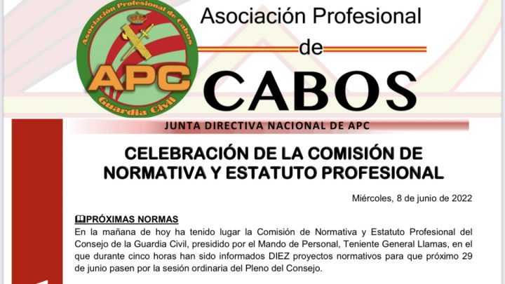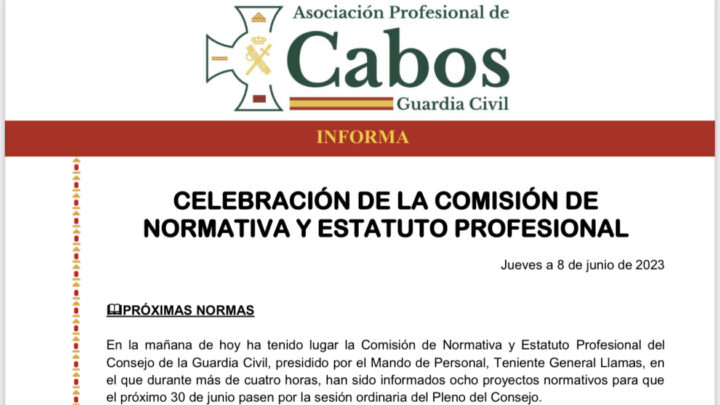 En la mañana de hoy ha tenido lugar la Comisión de Normativa y Estatuto Profesional del Consejo de la Guardia Civil, presidido por el Mando de Personal, Teniente General Llamas, en el que durante cinco horas han sido informados DIEZ proyectos normativos para que próximo 29 de junio pasen por la sesión ordinaria del Pleno del Consejo.