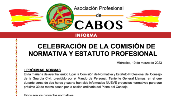 En la mañana de ayer tuvo lugar la Comisión de Normativa y Estatuto Profesional del Consejo de la Guardia Civil, presidido por el Mando de Personal, Teniente General Llamas, en el que durante cerca de dos horas y cuarto han sido informados NUEVE proyectos normativos para que próximo 30 de marzo pasen por la sesión ordinaria del Pleno del Consejo.