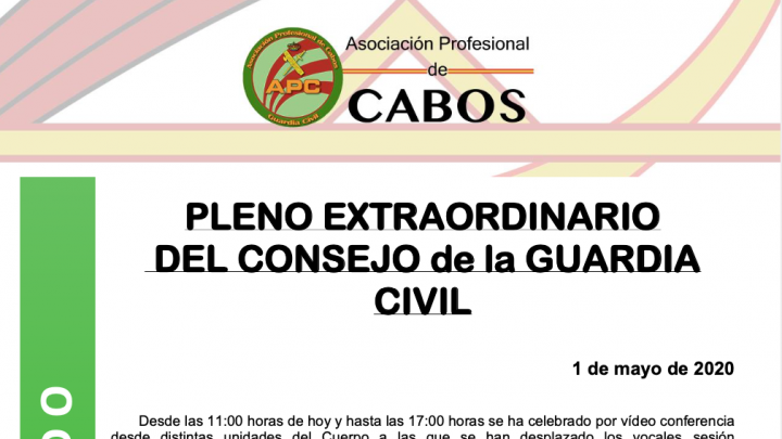 Desde las 11:00 horas de hoy y hasta las 17:00 horas se ha celebrado por vídeo conferencia desde distintas unidades del Cuerpo a las que se han desplazado los vocales sesión extraordinaria del pleno del Consejo de la Guardia Civil cuyo único punto del orden del día era la “Valoración por el Consejo de la Guardia Civil de la situación de afectación y salvaguardia de derecho a la vida, a la integridad física y moral, a la protección a la salud y prevención de riesgos laborales, derecho a la conciliación del personal de la Guardia Civil y de asociación profesional, como consecuencia de la crisis sanitaria producida por el COVID 19 y su incidencia en aspectos sociales, económicos y profesionales”.