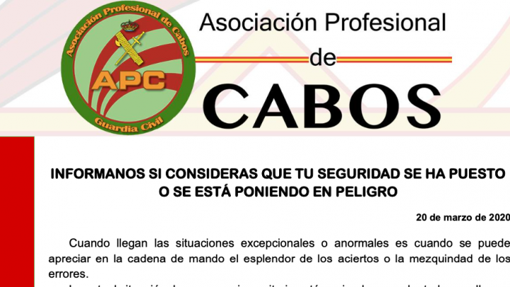 Los Guardias Civiles somos conscientes del estado de excepcionalidad que vive el país por las crisis sanitaria que nos ha tocado vivir. También somos conocedores de las carencias en material de protección en la que se encuentra el Estado pero es la Dirección General de la Guardia Civil, en virtud de la normativa en vigor en riesgos laborales, la que tiene la obligación de dotar de medios a los Guardias Civiles para trabajar en esta excepcional situación y por tanto nuestra obligación solicitar a este órgano de dirección, mediante escrito correspondiente, que tome medidas; no formuladas como reproche pero si como alegato a la verdad y las necesidades más perentorias de miles de hombres y mujeres que salen a la calle para hacer cumplir las normas, ayudar a los necesitados o generar certidumbre con su presencia anteponiendo su salud a cualquier otra circunstancia.