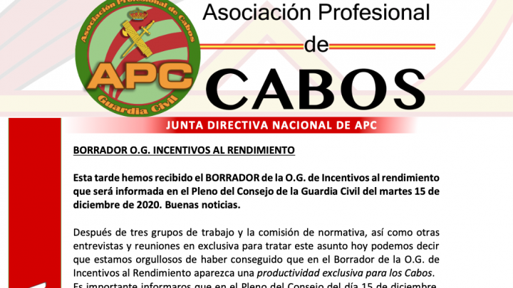 Esta tarde hemos recibido el BORRADOR de la O.G. de Incentivos al rendimiento que será informada en el Pleno del Consejo de la Guardia Civil del martes 15 de diciembre de 2020. Buenas noticias. DESCARGA EL INFORMA EN PDF Después de tres grupos de trabajo y la comisión de normativa, así como otras entrevistas y…