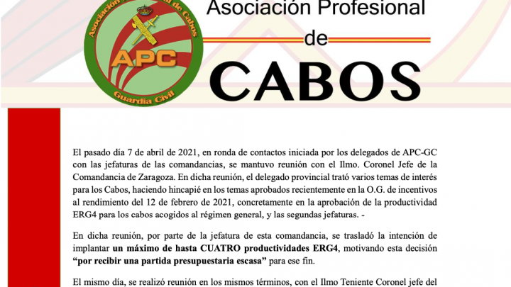 El pasado día 7 de abril de 2021, en ronda de contactos iniciada por los delegados de APC-GC con las jefaturas de las comandancias, se mantuvo reunión con el Ilmo. Coronel Jefe de la Comandancia de Zaragoza. En dicha reunión, el delegado provincial trató varios temas de interés para los Cabos, haciendo hincapié en los temas aprobados recientemente en la O.G. de incentivos al rendimiento del 12 de febrero de 2021, concretamente en la aprobación de la productividad ERG4 para los cabos acogidos al régimen general, y las segundas jefaturas.