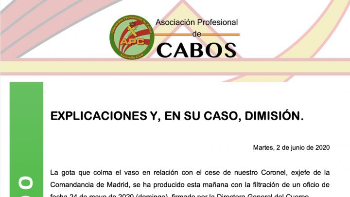Descarga el comunicado en PDF La gota que colma el vaso en relación con el cese de nuestro Coronel, exjefe de la Comandancia de Madrid, se ha producido esta mañana con la filtración de un oficio de fecha 24 de mayo de 2020 (domingo), firmado por la Directora General del Cuerpo. Los escorzos, quiebros, requiebros…