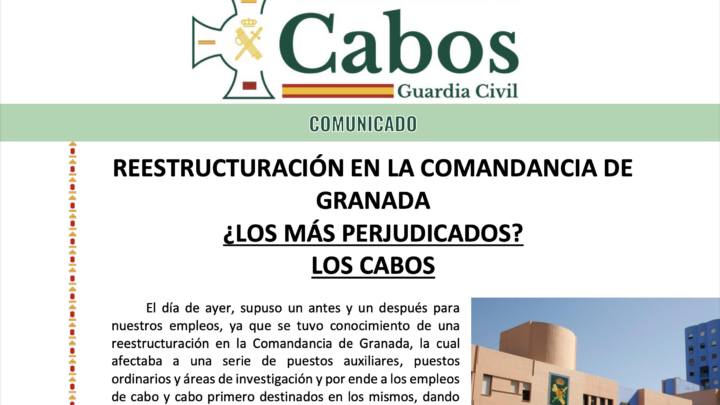 El día de ayer, supuso un antes y un después para nuestros empleos, ya que se tuvo conocimiento de una reestructuración en la Comandancia de Granada, la cual afectaba a una serie de puestos auxiliares, puestos ordinarios y áreas de investigación y por ende a los empleos de cabo y cabo primero destinados en los mismos, dando desde la DGGC, 48 horas para que dichos efectivos mostrasen su voluntariedad para obtener preferente en la provincia o eligieran un nuevo destino sin pensar en ningún momento lo que ello conlleva para el personal afectado y sus familias.