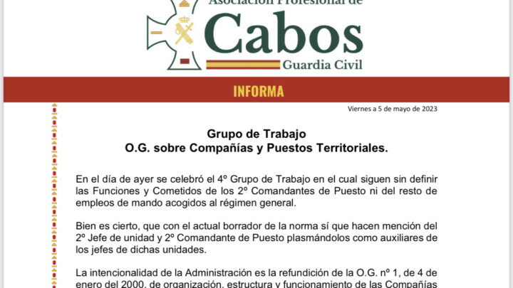 En el día de ayer se celebró el 4o Grupo de Trabajo en el cual siguen sin definir las Funciones y Cometidos de los 2o Comandantes de Puesto ni del resto de empleos de mando acogidos al régimen general.