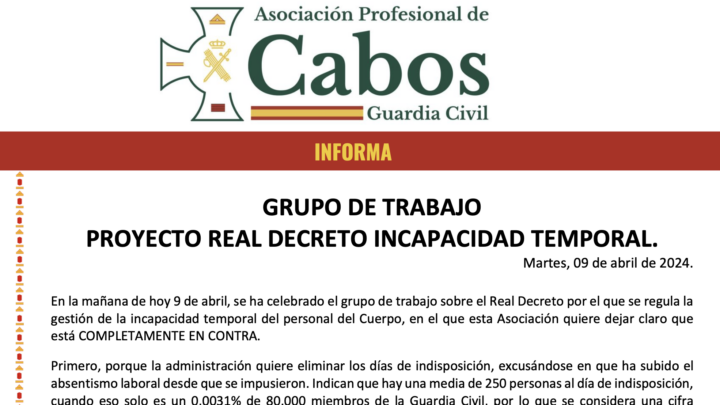 En la mañana de hoy 9 de abril, se ha celebrado el grupo de trabajo sobre el Real Decreto por el que se regula la gestión de la incapacidad temporal del personal del Cuerpo, en el que esta Asociación quiere dejar claro que está COMPLETAMENTE EN CONTRA.