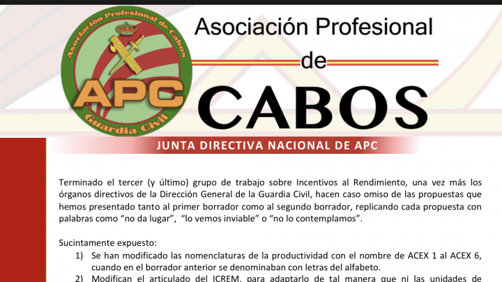 Terminado el tercer (y último) grupo de trabajo sobre Incentivos al Rendimiento, una vez más los órganos directivos de la Dirección General de la Guardia Civil, hacen caso omiso de las propuestas que hemos presentado tanto al primer borrador como al segundo borrador, replicando cada propuesta con palabras como “no da lugar”, “lo vemos inviable” o “no lo contemplamos”.