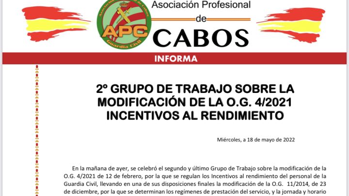 En la mañana de ayer, se celebró el segundo y último Grupo de Trabajo sobre la modificación de la O.G. 4/2021 de 12 de febrero, por la que se regulan los Incentivos al rendimiento del personal de la Guardia Civil, llevando en una de sus disposiciones finales la modificación de la O.G. 11/2014, de 23 de diciembre, por la que se determinan los regímenes de prestación del servicio, y la jornada y horario del personal de la Guardia Civil.