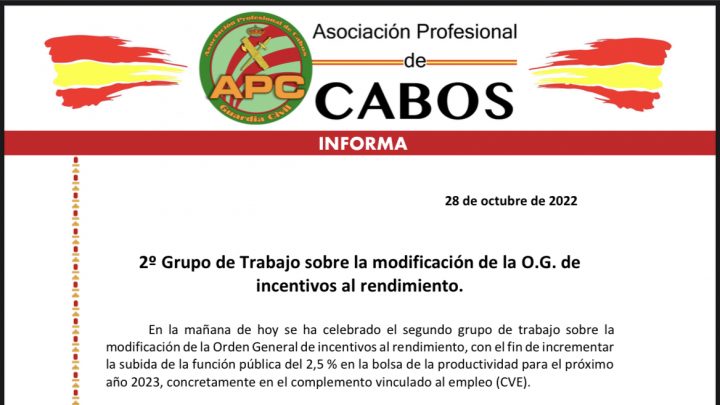 En la mañana de hoy se ha celebrado el segundo grupo de trabajo sobre la modificación de la Orden General de incentivos al rendimiento, con el fin de incrementar la subida de la función pública del 2,5 % en la bolsa de la productividad para el próximo año 2023, concretamente en el complemento vinculado al empleo (CVE).