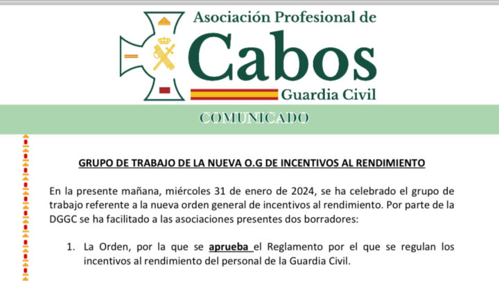 En la mañana de hoy, miércoles 23 de octubre de 2024, se ha celebrado un nuevo Grupo de Trabajo referente a nueva Orden General de incentivos al rendimiento. El borrador presentado por la DGGC es totalmente distinto al anterior, sobre el que se había trabajado en los otros Grupos de Trabajo. Se modifica el nombre…