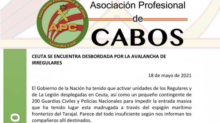El Gobierno de la Nación ha tenido que activar unidades de los Regulares y de La Legión desplegadas en Ceuta, así como un pequeño contingente de 200 Guardias Civiles y Policías Nacionales para impedir la entrada masiva que ha tenido lugar esta madrugada a través del espigón marítimo fronterizo del Tarajal. Parece del todo insuficiente según nos informan los compañeros allí destinados.