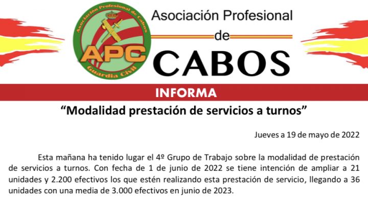 Esta mañana ha tenido lugar el 4o Grupo de Trabajo sobre la modalidad de prestación de servicios a turnos. Con fecha de 1 de junio de 2022 se tiene intención de ampliar a 21 unidades y 2.200 efectivos los que estén realizando esta prestación de servicio, llegando a 36 unidades con una media de 3.000 efectivos en junio de 2023.