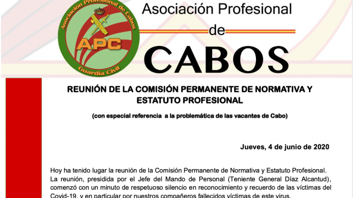 Descarga el comunicado en PDF Hoy ha tenido lugar la reunión de la Comisión Permanente de Normativa y Estatuto Profesional. La reunión, presidida por el Jefe del Mando de Personal (Teniente General Díaz Alcantud), comenzó con un minuto de respetuoso silencio en reconocimiento y recuerdo de las víctimas del Covid-19, y en particular por nuestros…
