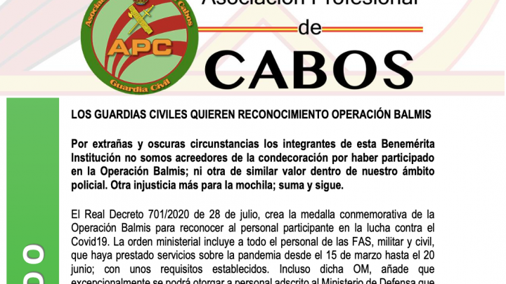 Descarga el comunicado en PDF Por extrañas y oscuras circunstancias los integrantes de esta Benemérita Institución no somos acreedores de la condecoración por haber participado en la Operación Balmis; ni otra de similar valor dentro de nuestro ámbito policial. Otra injusticia más para la mochila; suma y sigue. El Real Decreto 701/2020 de 28 de…