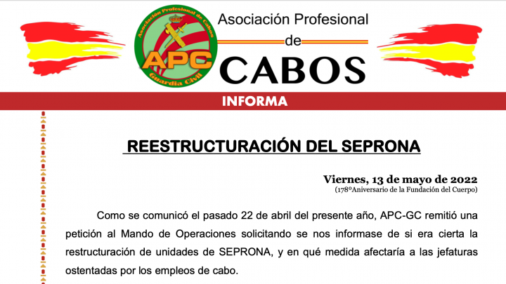 Como se comunicó el pasado 22 de abril del presente año, APC-GC remitió una petición al Mando de Operaciones solicitando se nos informase de si era cierta la restructuración de unidades de SEPRONA, y en qué medida afectaría a las jefaturas ostentadas por los empleos de cabo.