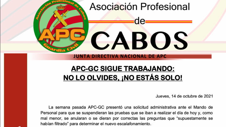 La semana pasada APC-GC presentó una solicitud administrativa ante el Mando de Personal para que se suspendieran las pruebas que se iban a realizar el día de hoy y, como mal menor, se anularan o se dieran por correctas las preguntas que “supuestamente se habían filtrado” para determinar el nuevo escalafonamiento.