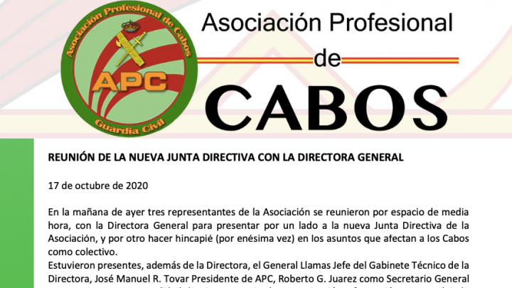 En la mañana de ayer tres representantes de la Asociación se reunieron por espacio de media hora, con la Directora General para presentar por un lado a la nueva Junta Directiva de la Asociación, y por otro hacer hincapié (por enésima vez) en los asuntos que afectan a los Cabos como colectivo. Descarga el comunicado…