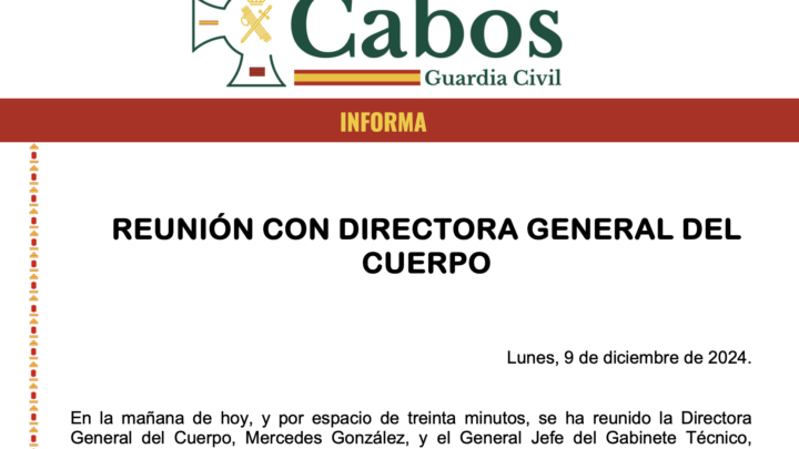Lunes, 9 de diciembre de 2024. En la mañana de hoy, y por espacio de treinta minutos, se ha reunido la Directora General del Cuerpo, Mercedes González, y el General Jefe del Gabinete Técnico, Blanes González, con nuestro Presidente, Cabo Mayor Rodríguez Tovar y Vicepresidente, Cabo 1º López Estévez. Debido al corto espacio de tiempo…
