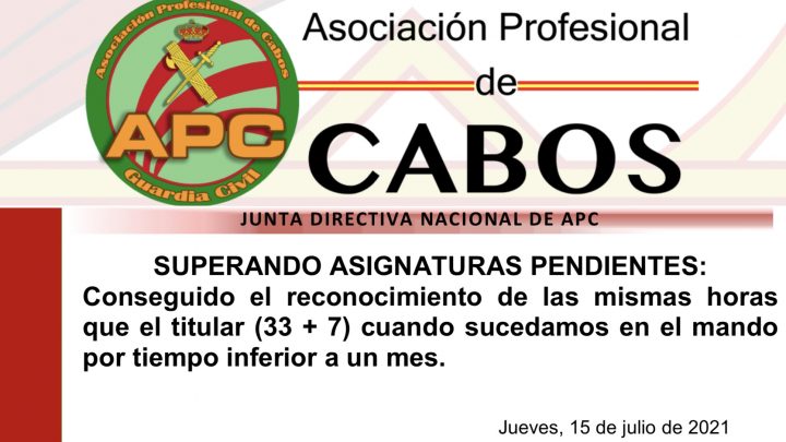 Desde que se crearon las segundas jefaturas, APC-GC siempre consideró como su asignatura pendiente que la Dirección General reconociera horas de disponibilidad para el segundo jefe, pues tal y como quedaba regulado el artº 43 de la OG núm. 11/2014, de 23 de diciembre, después de la modificación operada por la OG  núm. 4 de 12 de febrero de 2021, el segundo jefe (en la mayoría cabos y cabos 1ºs) era el personal del régimen general que más horas de servicio presenciales realizaba en la Guardia Civil.