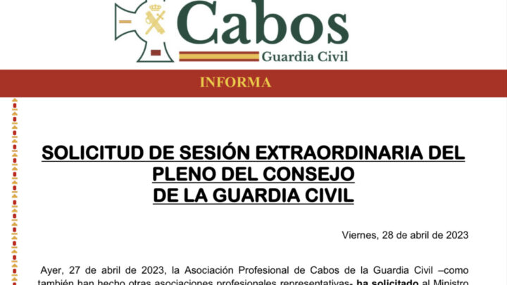 Ayer, 27 de abril de 2023, la Asociación Profesional de Cabos de la Guardia Civil –como también han hecho otras asociaciones profesionales representativas- ha solicitado al Ministro del Interior –Presidente del Consejo de la Guardia Civil- la celebración de un pleno EXTRAORDINARIO del Consejo para tratar la situación de la jornada y horario del personal de la Guardia Civil, proponiendo seis puntos para el orden del día en el que se plantean cuestiones sobre